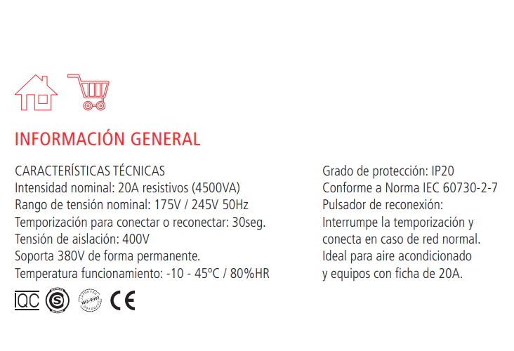 • Intensidad nominal: 20A resistivos (hasta 4500 VA)